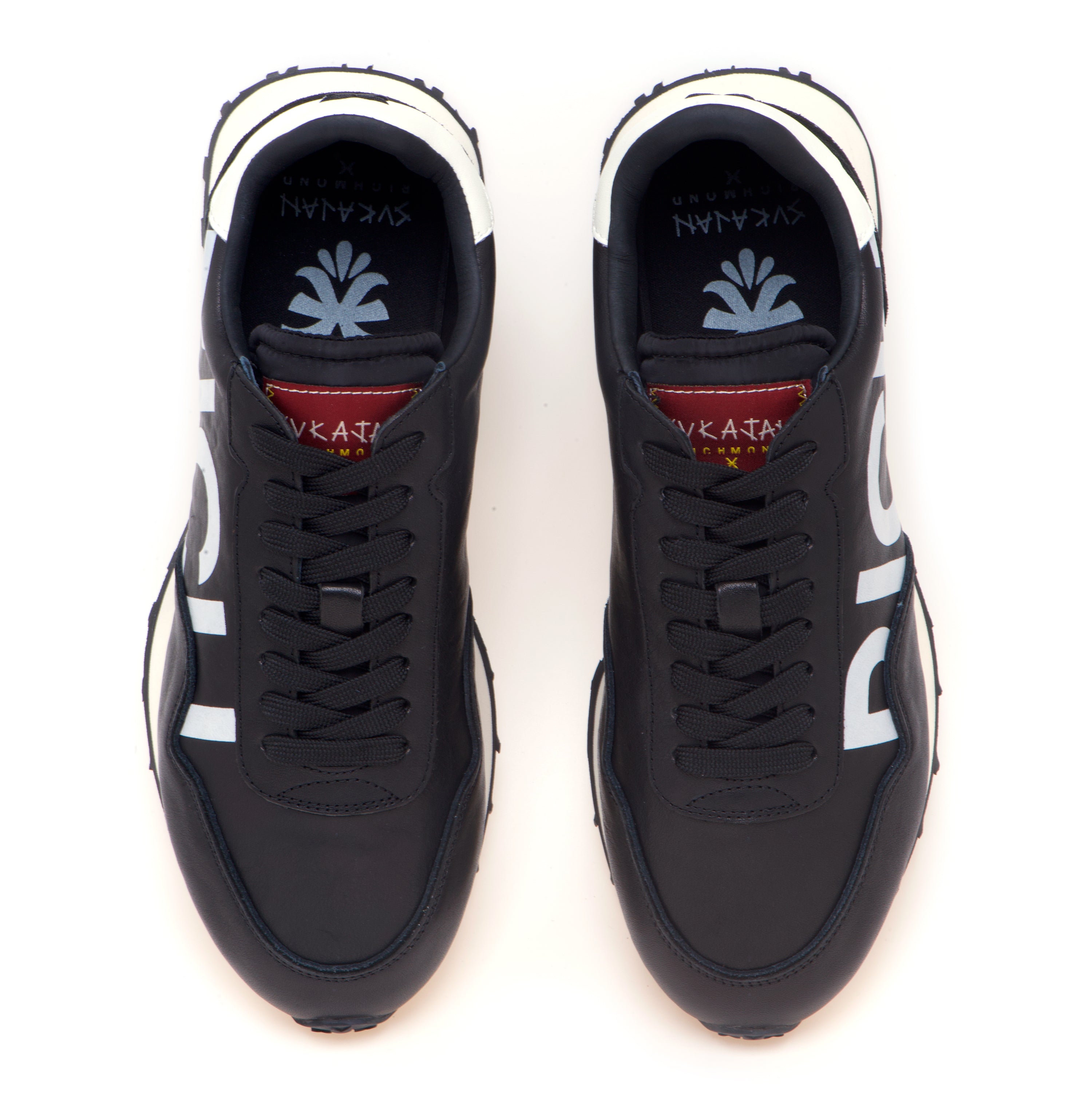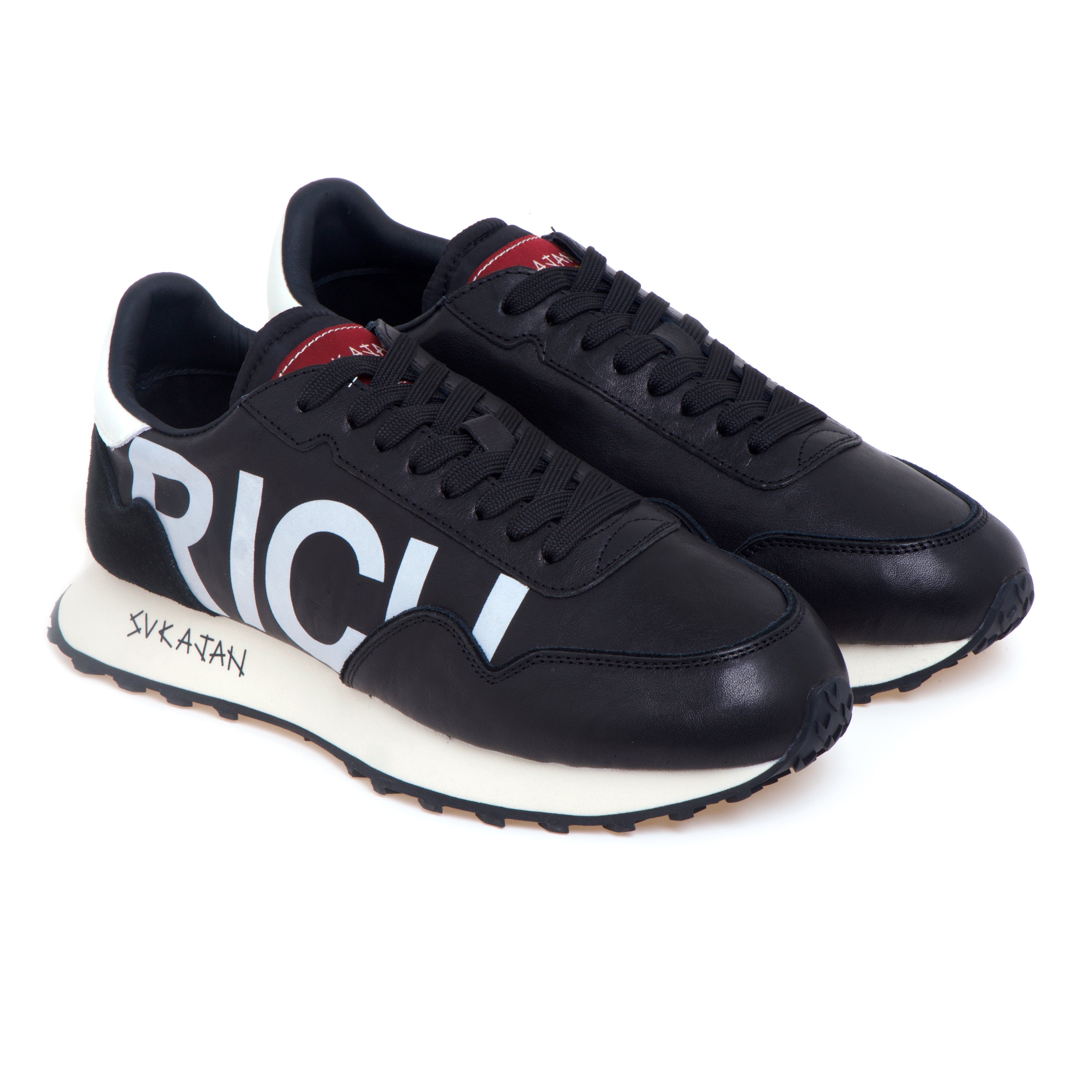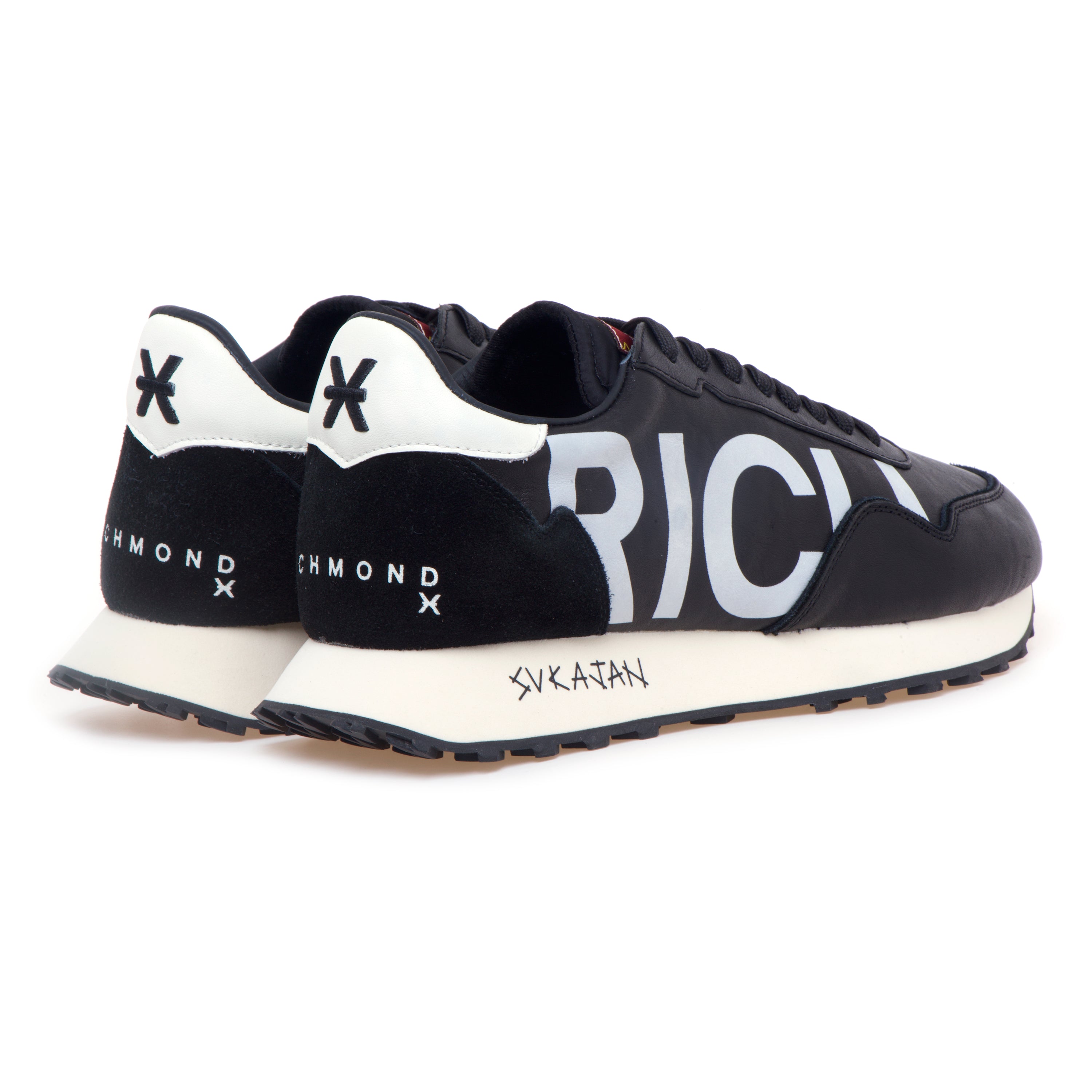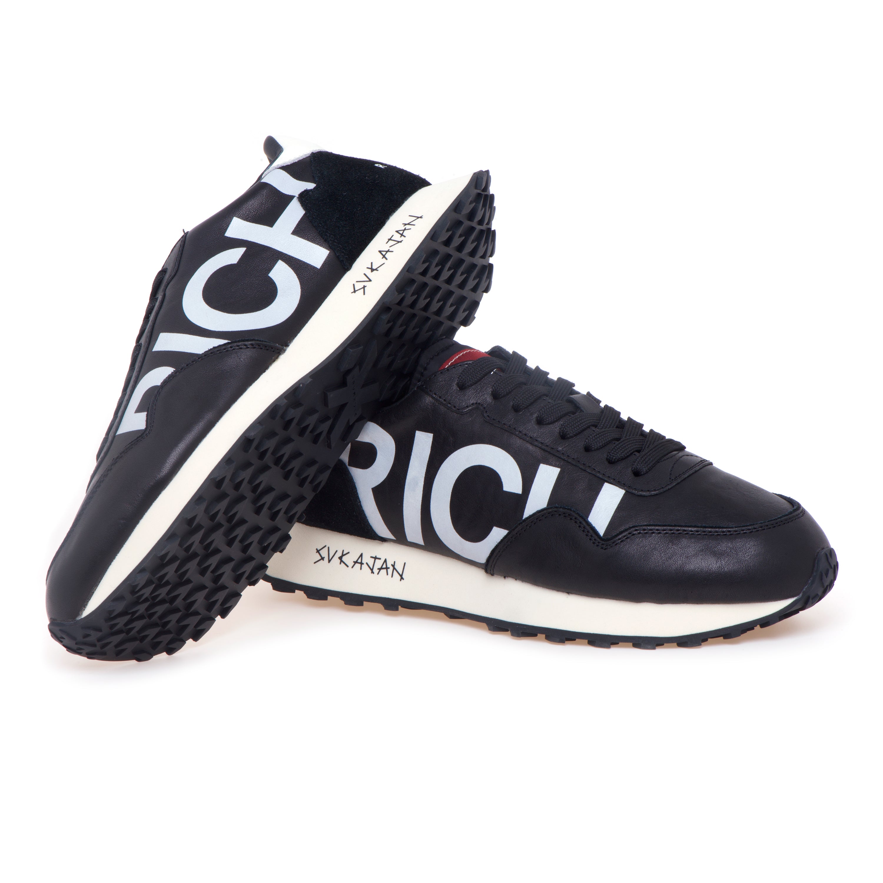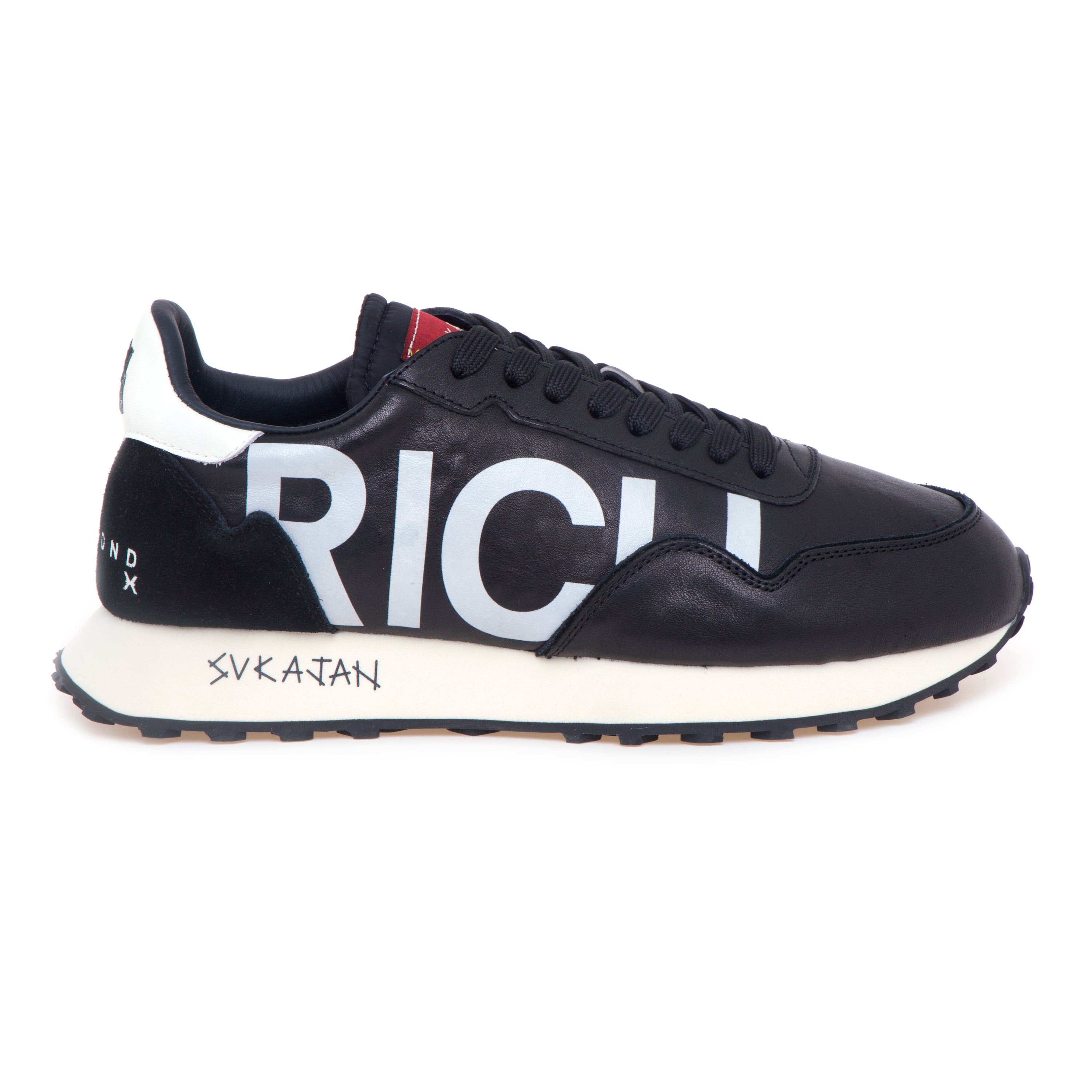 # Tomaia in nappa nera con maxi lettering “RICH” laterale.