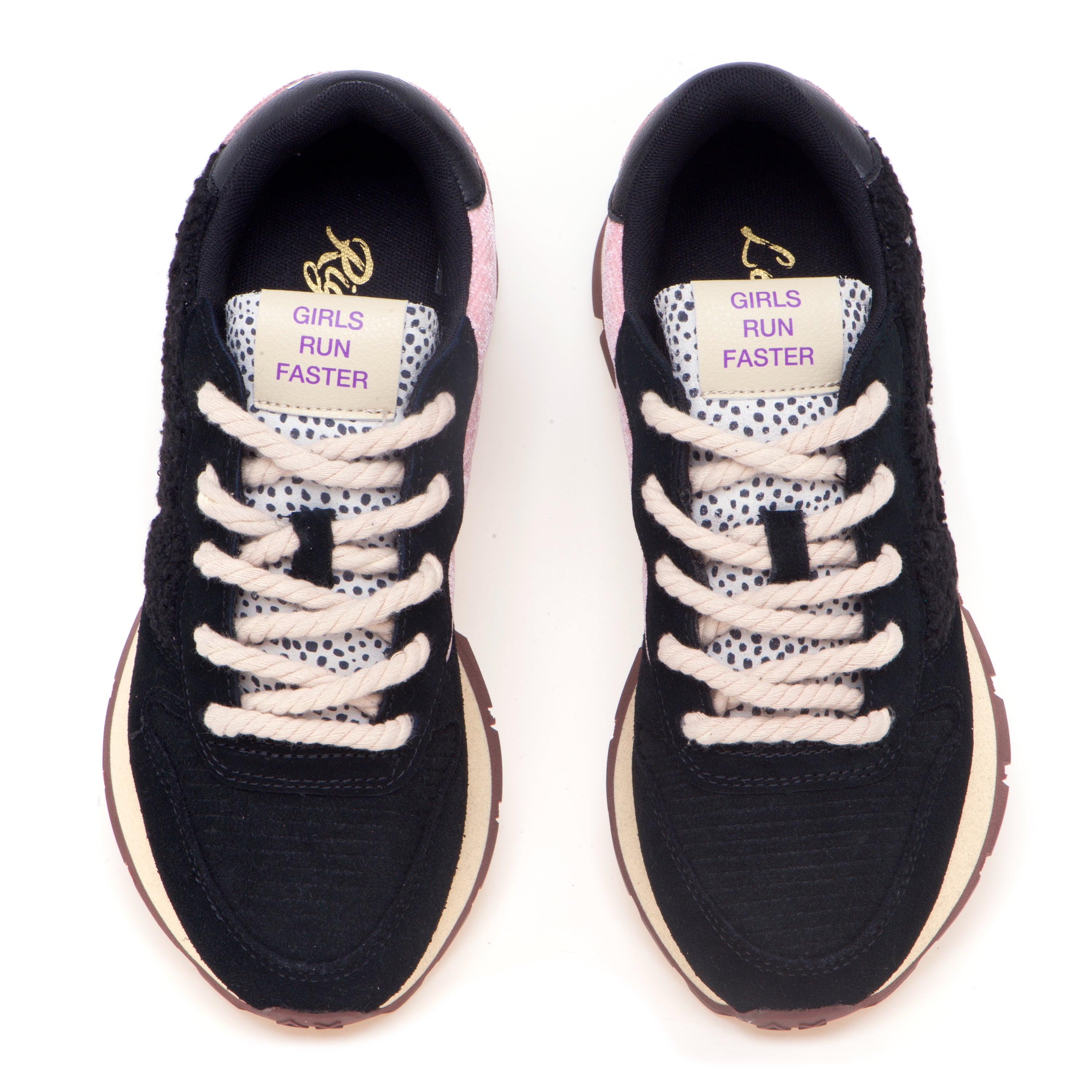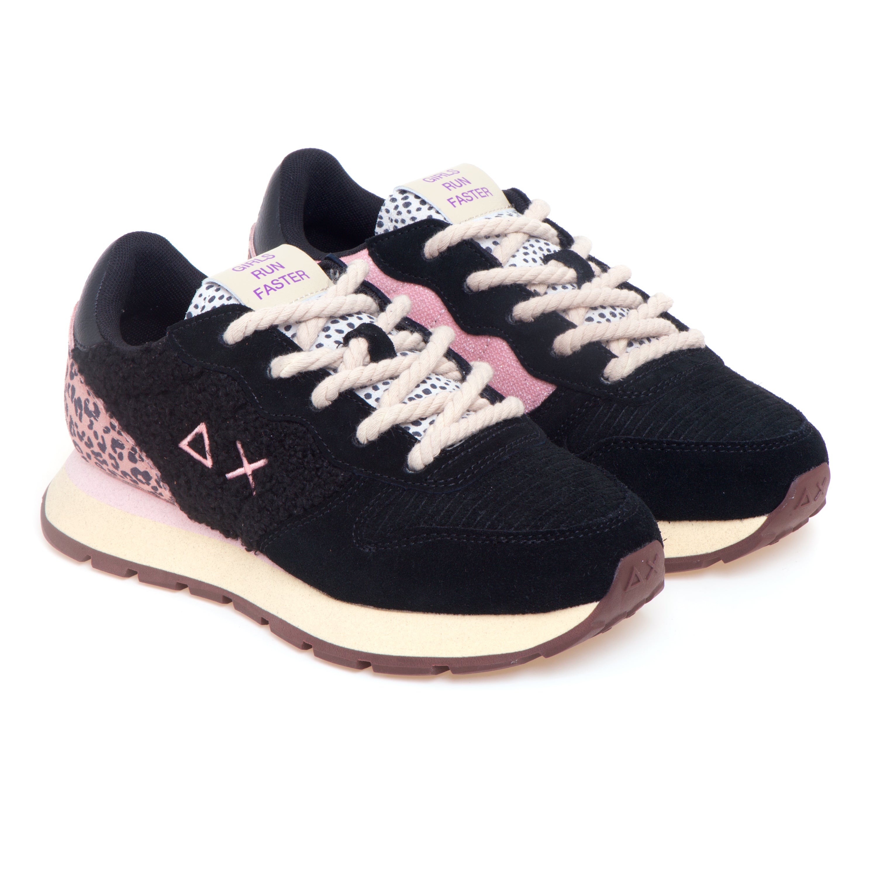 SUN68 Ally Winter porta lo spirito running in chiave urbana e calda, con una selezione di materiali pensati per la stagione fredda. La tomaia combina suede e teddy per un effetto tattile ricco, valorizzato da inserti in camoscio stampa animalier e dettagli in velluto che aggiungono profondità al look. I lacci a cordino, ispirati ai boots da neve anni ’80, donano carattere e praticità; l’etichetta con lettering sulla linguetta e il logo ricamato sul lato completano la firma del brand. All’interno, la fodera in micro mesh favorisce traspirabilità; sotto, l’EVA fresata assicura leggerezza e comfort, mentre il battistrada in gomma garantisce aderenza su fondi urbani.
