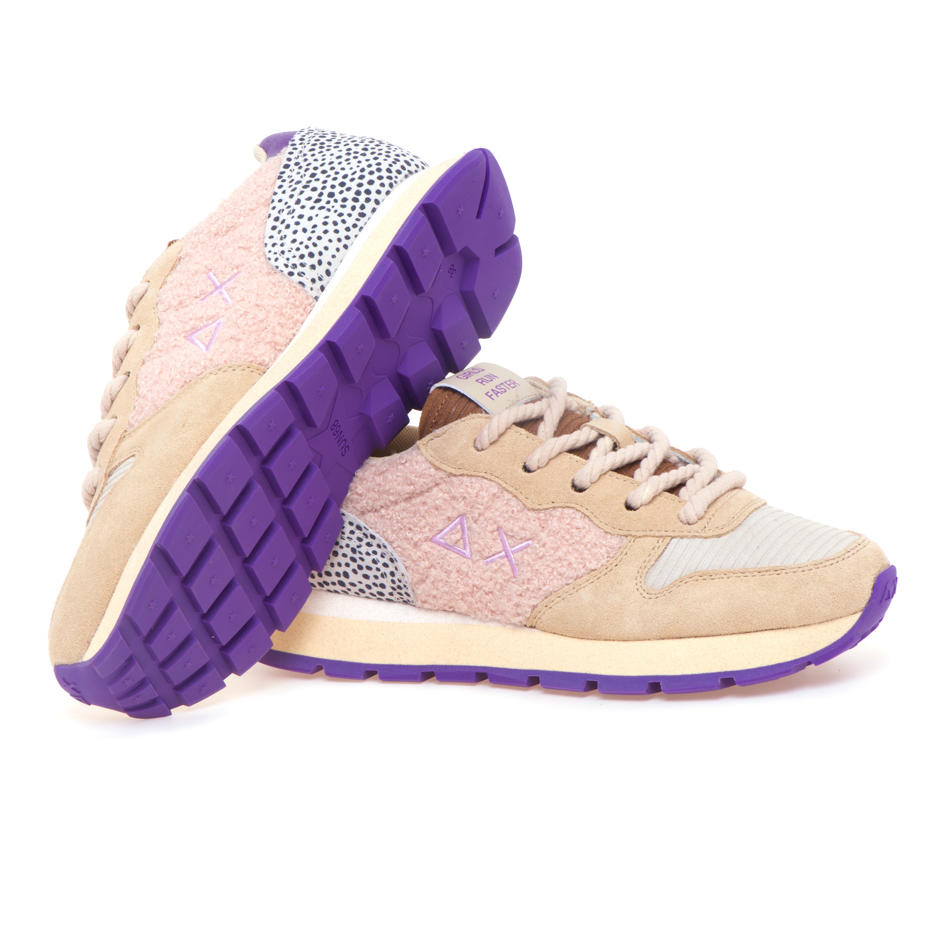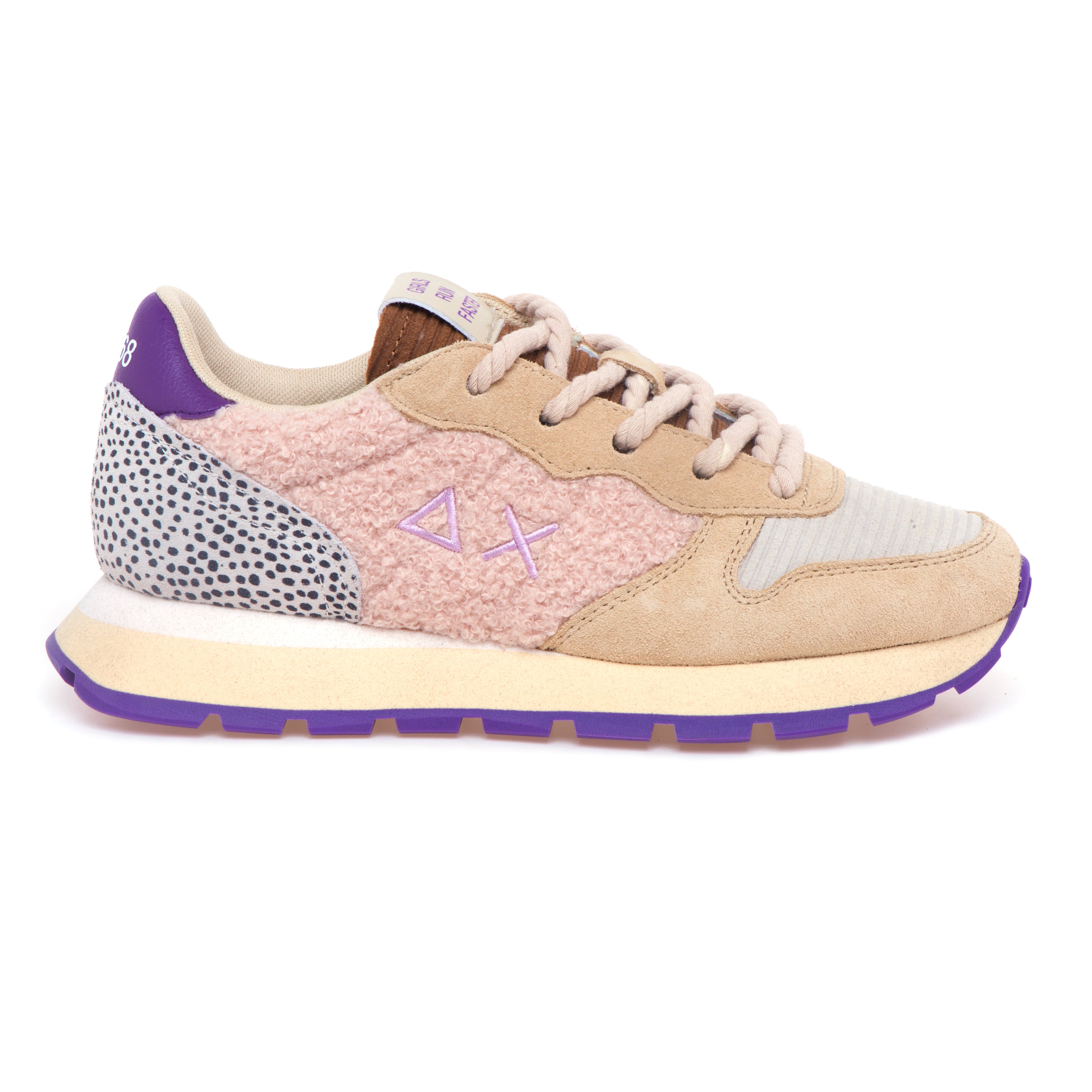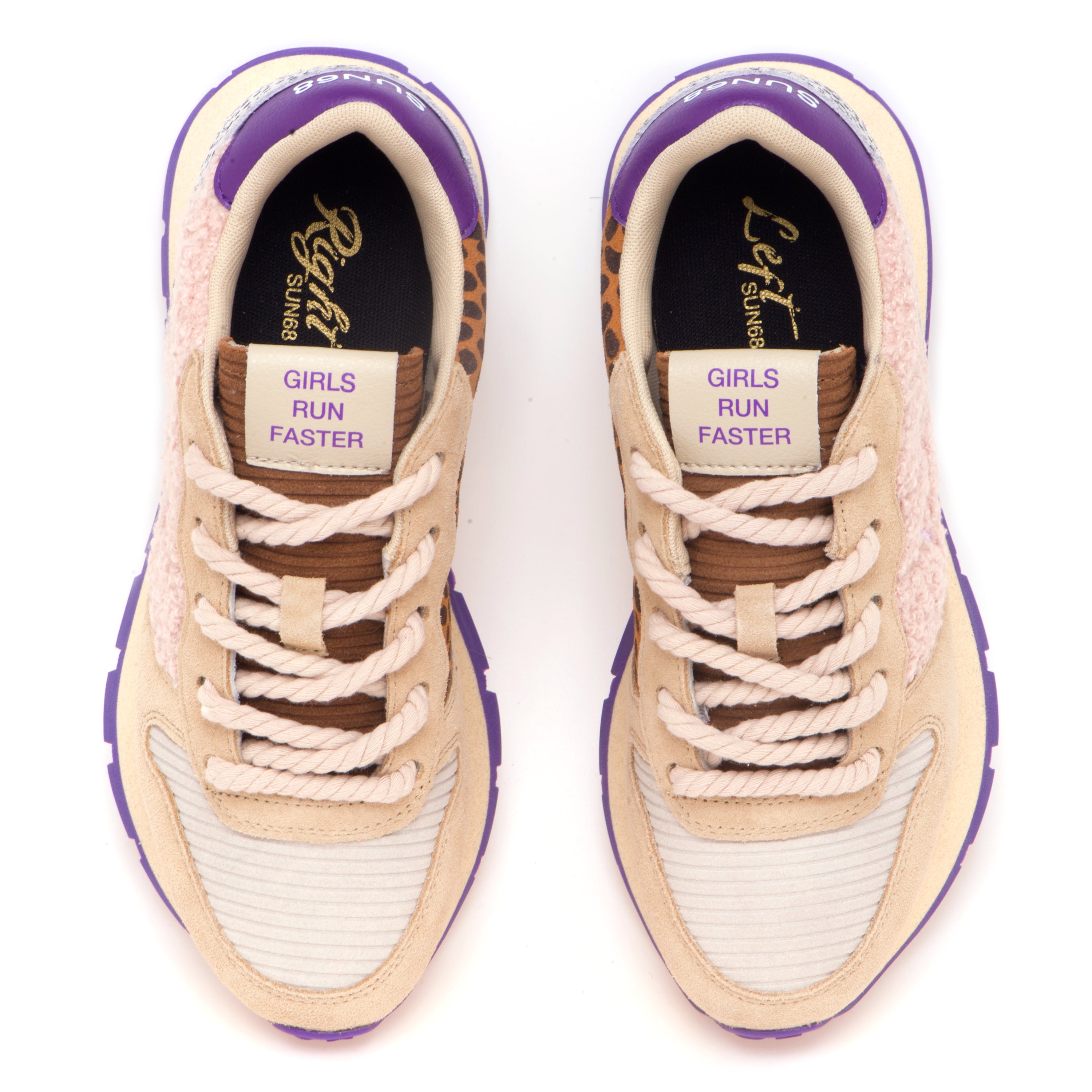 SUN68 Ally Winter porta lo spirito running in chiave urbana e calda, con una selezione di materiali pensati per la stagione fredda. La tomaia combina suede e teddy per un effetto tattile ricco, valorizzato da inserti in camoscio stampa animalier e dettagli in velluto che aggiungono profondità al look. I lacci a cordino, ispirati ai boots da neve anni ’80, donano carattere e praticità; l’etichetta con lettering sulla linguetta e il logo ricamato sul lato completano la firma del brand. All’interno, la fodera in micro mesh favorisce traspirabilità; sotto, l’EVA fresata assicura leggerezza e comfort, mentre il battistrada in gomma garantisce aderenza su fondi urbani.