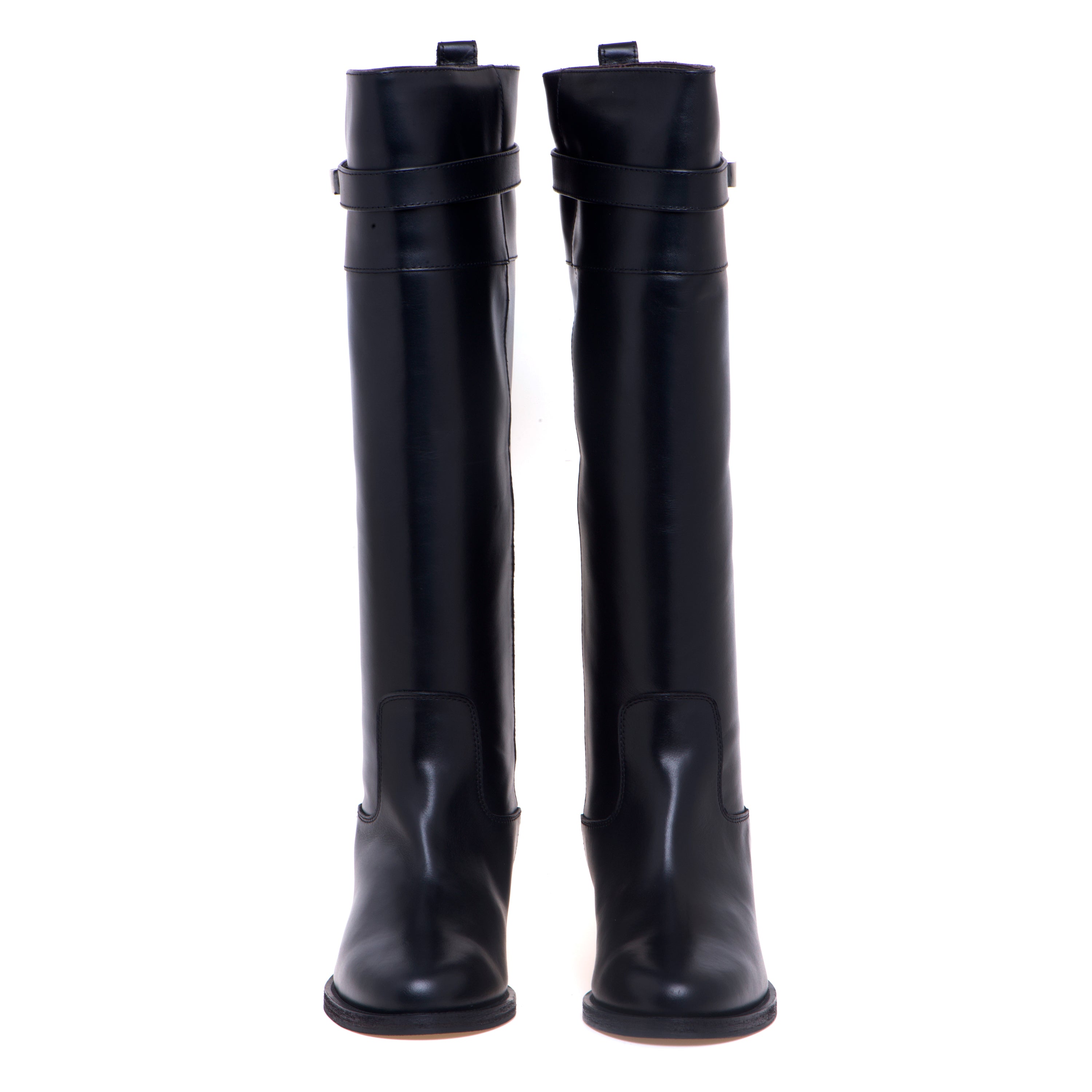 Lo stivale Via Roma 15 in pelle con zeppa interna unisce eleganza e comfort quotidiano e introduce un dettaglio esclusivo: una banda tono su tono sulla parte alta del gambale su cui è applicato il cinturino in pelle con accessorio a lucchetto in metallo.
